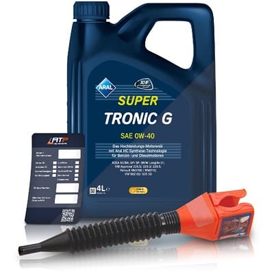 | Besonderheiten des Bundles | Enthält 4 Liter Aral SuperTronic G 0W-40, einen langlebigen Anhänger zur Kennzeichnung von Öltyp und Wechseldatum sowie einen präzisen Einfülltrichter für einen sauberen Ölwechsel. |