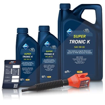 Das Set enthält das leistungsstarke Aral SuperTronic K 5W-30 in einem praktischen 7-Liter-Gebinde. Zusätzlich erhalten Sie einen robusten Ölwechsel-Anhänger, der Ihnen hilft, den nächsten Wechsel nicht zu vergessen, sowie einen hochwertigen Trichter für eine saubere und sichere Befüllung Ihres Motors.